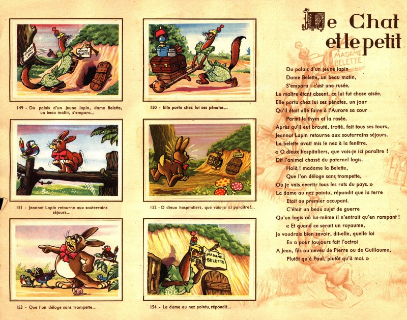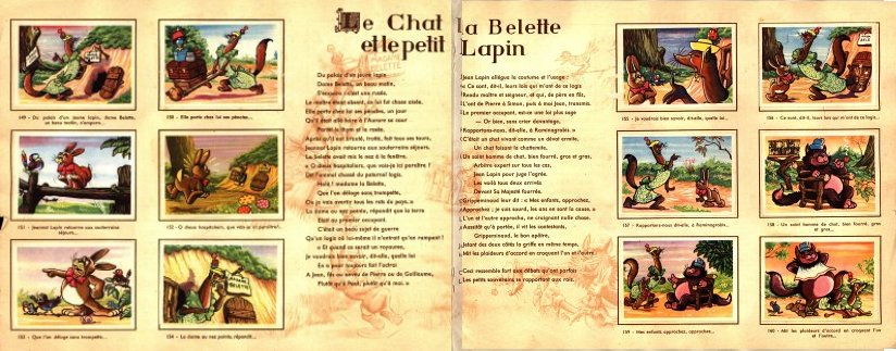 The good luck of finding a complete two-volume set of these albums has led me to include this set among the books of the collection, while another complete set remains among the objects. Here 132 numbered cards are pasted in around La Fontaine's text. The cartoons remain delightfully Disneyesque. I enjoy the fat weasel who cannot get back out through the hole through which she entered (#108-12). In this book, the number of cards per fable and their sizes vary from presentation to presentation. The images of the beetle hammering eggs and throwing eggs out of the nest (#180) are wonderful! The pages here have subtle images of the appropriate fable done in light brown ink behind the black ink of the text. The front cover of the work features a bear watching TT and a coach and fly. A fox, rabbit, and tree are fellow spectators. The back cover has many animals either carrying Menier chcolate products or admiring a young woman painting a bilboard for Menier chocolates. On the last page, one reads how to get cards from the Menier Company. One gets a desired card by sending in three others! With this system, Menier could have gone on forever sending people the cards they needed! A laid-in paper announces "Conditions d'Échanges" and mentions a special Paris office for Chocolat-Menier vignettes. This album is in fair condition. One can also find this album listed as a book under "1950?", as well as individual Menier slips identical with individual slips in this album.