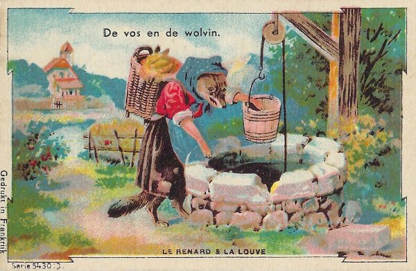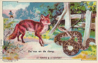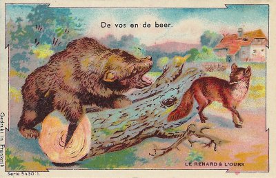 These cards have three identifying characteristics: (1) the "Chicorei Talpe" written across the French text on the verso; (2) the unusual instepped borders, hard to describe but easy to notice; and (3) the "5430" series indicated in the lower left. Here we have five of the -- apparently -- six in the series. The good news for this collection is that we have a set of five cards in a "5430" series under "Fable Card Series." The lacking number there (#1) is present here: "Renard and the Bear." The lacking number here (#5) is present there: "The Horse and the Wolf." There is also a single card in this format under single stock trade cards, picturing the fox and the snake. As I mentioned a propos of "5430," there is very nice chromolithography on these cards. 4" x 2¾". Chicorei Talpe was produced in Roeselare, Belgium.