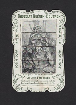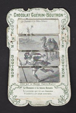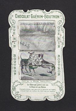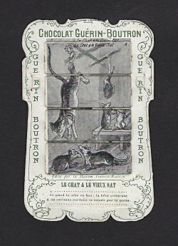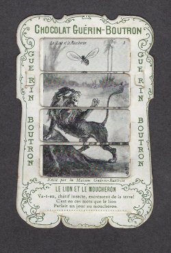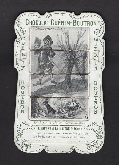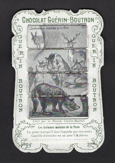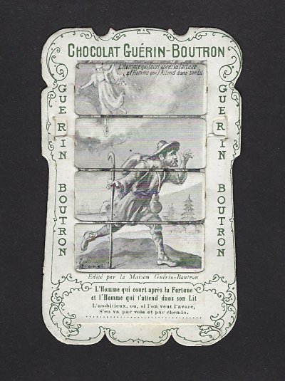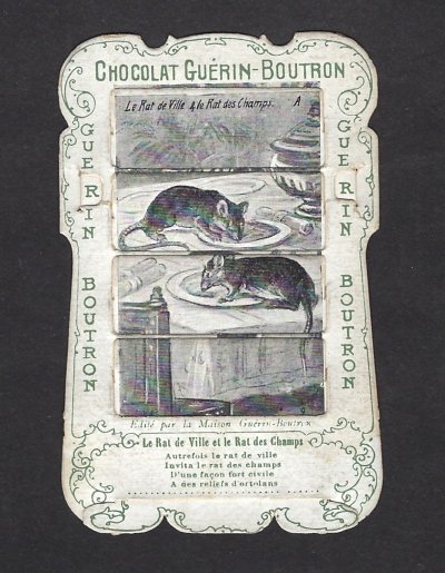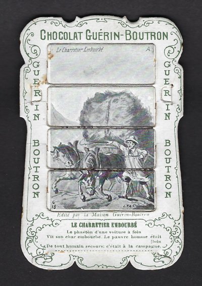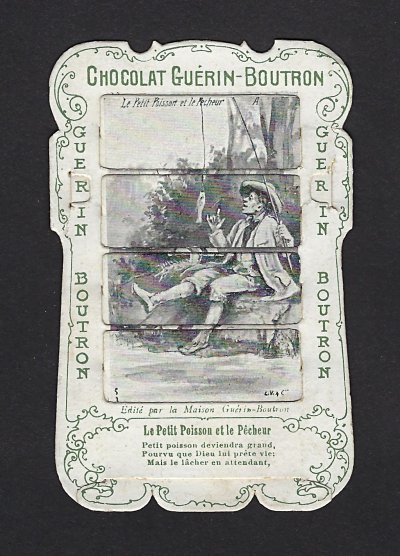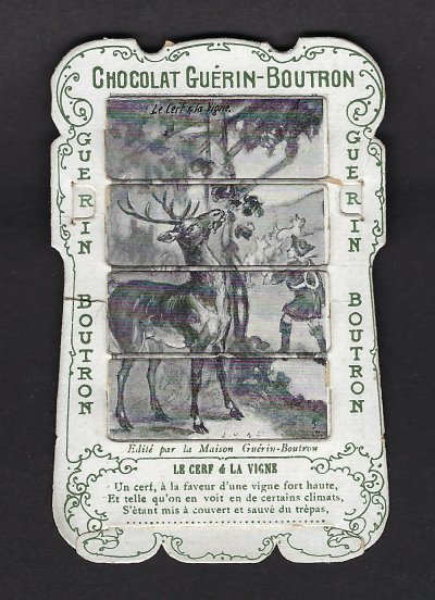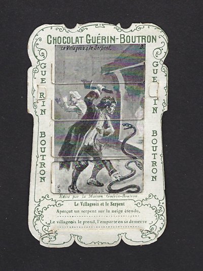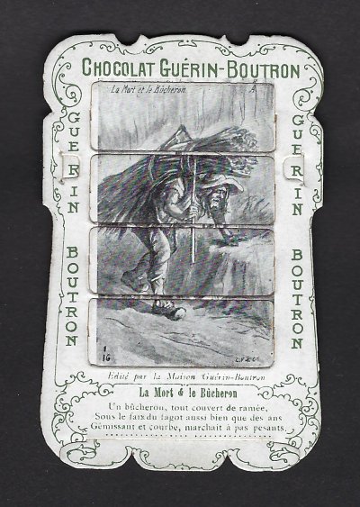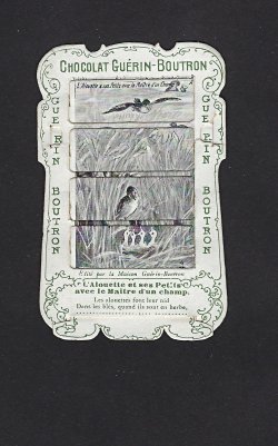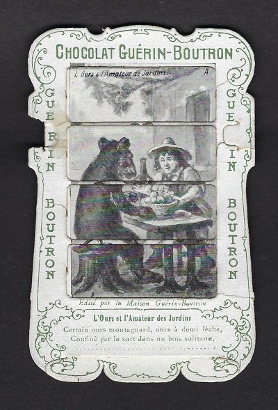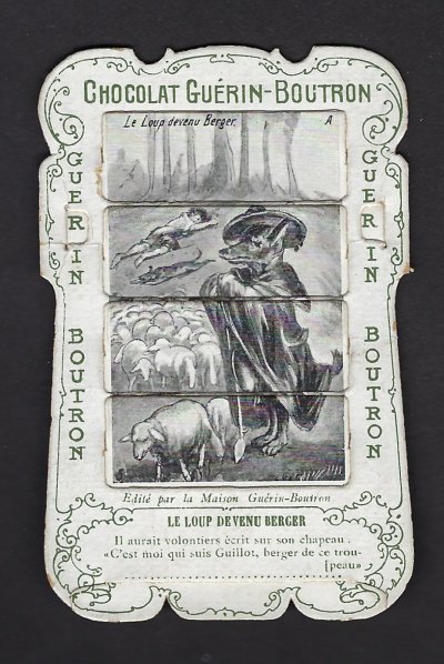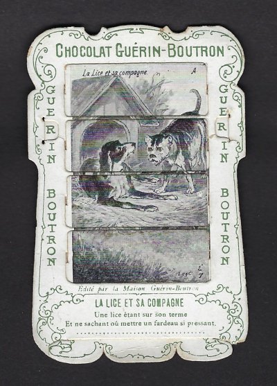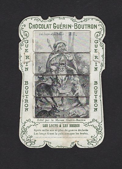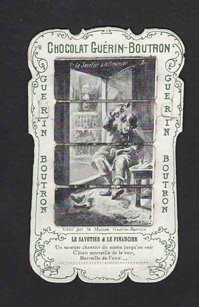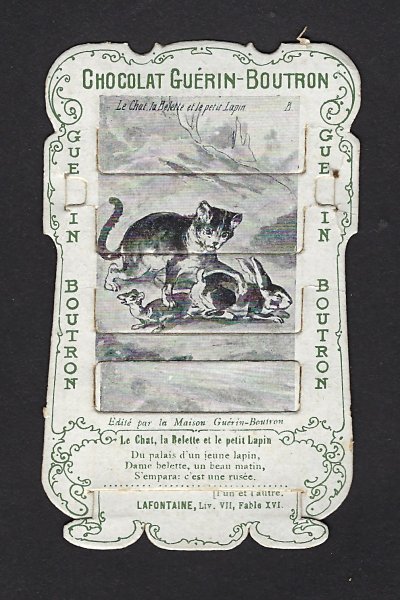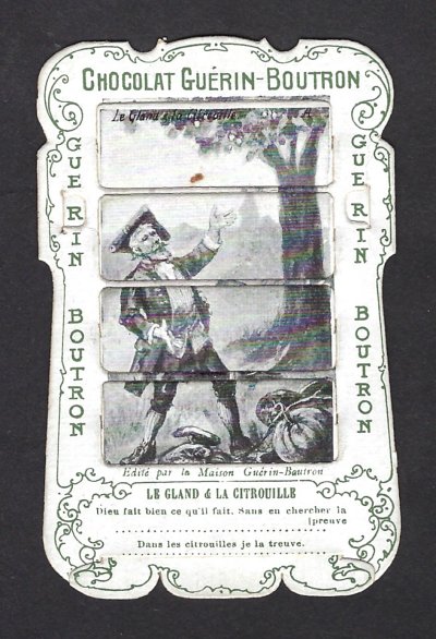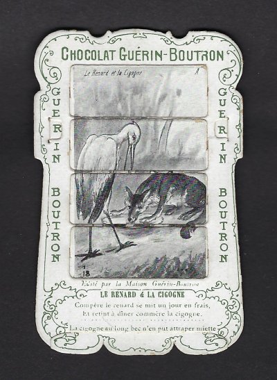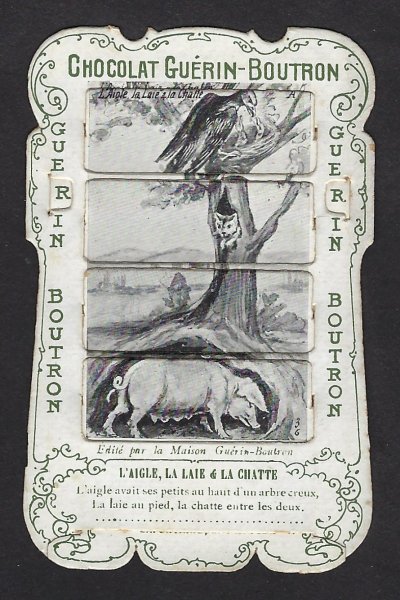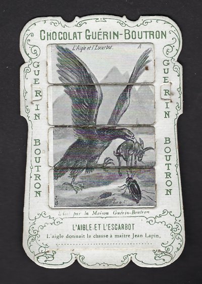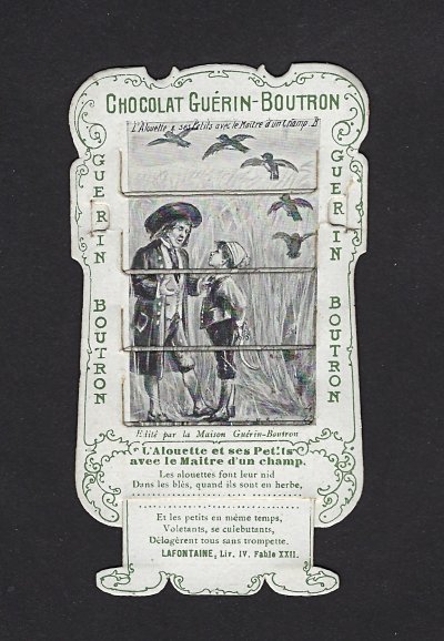 1890? 56 mechanical cards with sliding panels advertising "Chocolat Guérin-Boutron." 2½" x 4". One card for €8 in St.-Ouen, August, '15. Fifteen further cards for $12 each from Bertrand Cocq, Calonne Ricouart, France, Sept., '20. A third set of thirteen mechanical cards for €321 from olivier9862 on Ebay, July, ’21, including extras of “Cobbler and Financier” and “Lark and Her Young Ones.” A set of 12 for €222 from Chromosetcollections through Ebay, August, ’21. One more from Chromosetcollections through Ebay for €18, Oct., '21. And BC for €19 from la-loutre-curieuse through Ebay, Nov., '21. A set of eight from Benoit Thibault for €140, May, '22. Another group of eight for €200 from Albert van den Bosch, Antwerp, June, '23.