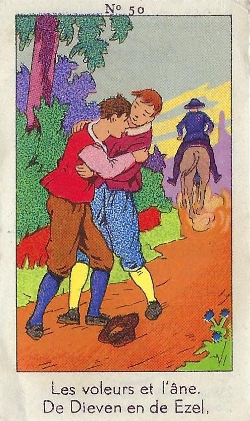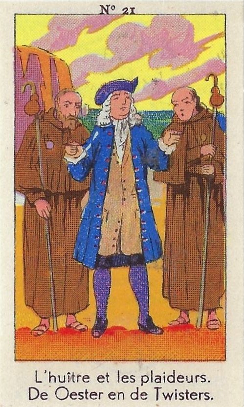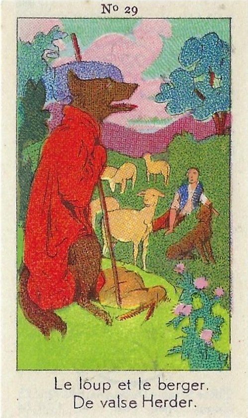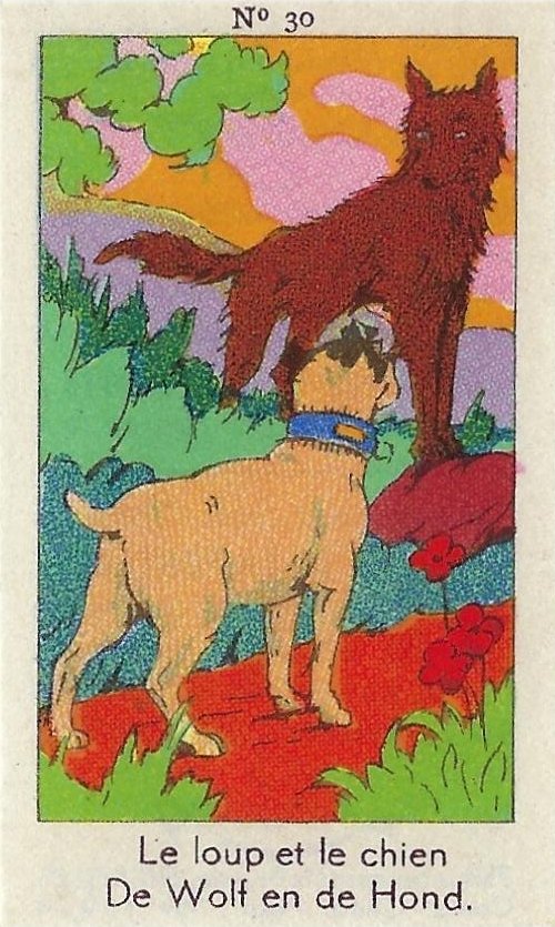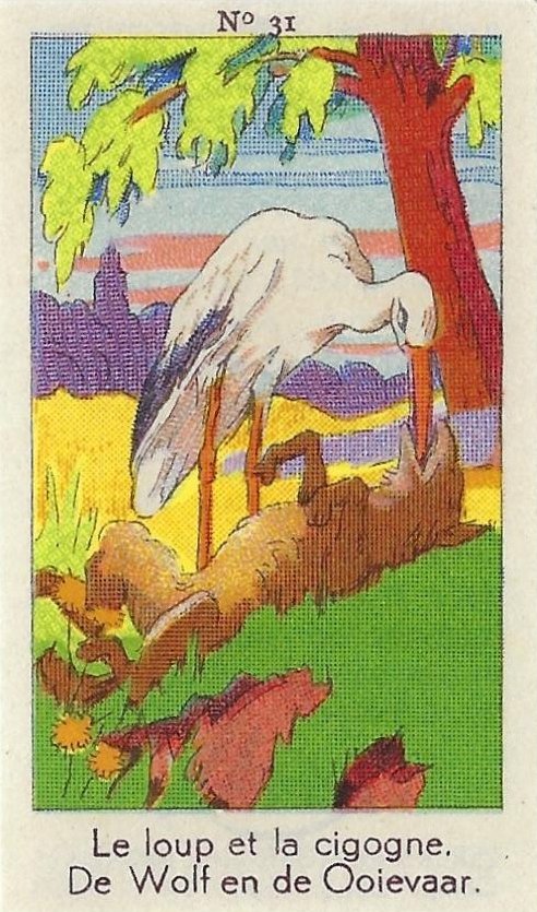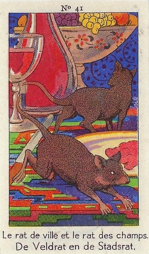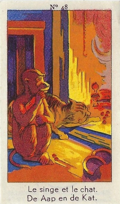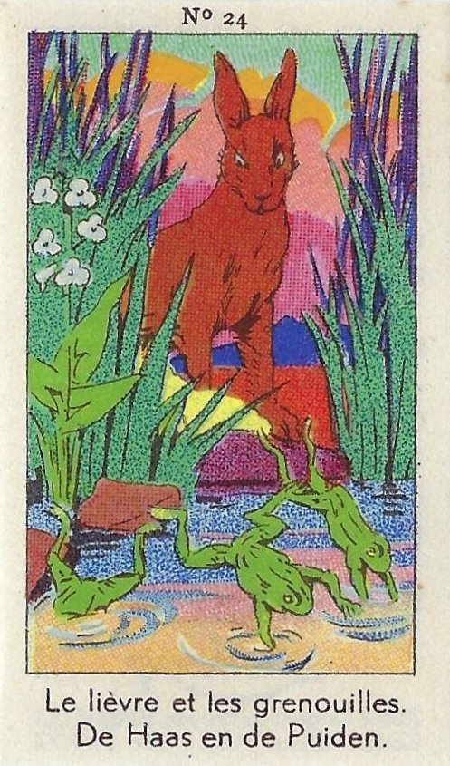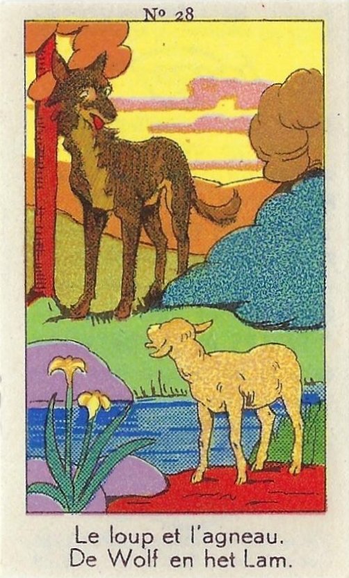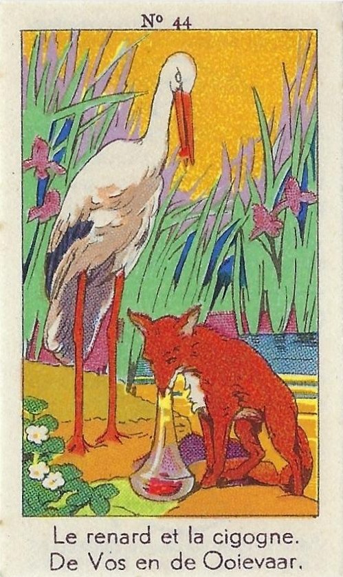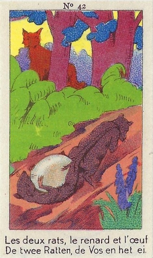 1930? Fifty numbered small⅝ slips (identified on the verso as "Chromos" on both languages) 1⅝" by 2¾" featuring La Fontaine's fables with titles in French and Flemish. Each verso has identical French and Flemish advertisements for Lecocq chocolate and candies and mention of albums in which to put these fifty chromos. AU$17.50 from 191Scazna through Ebay, August, '20.