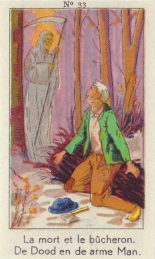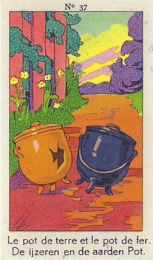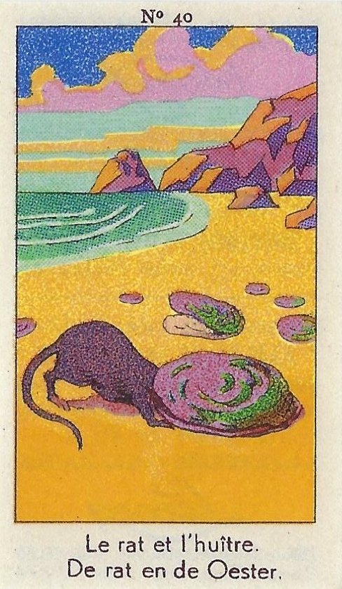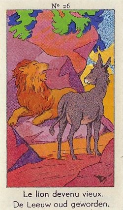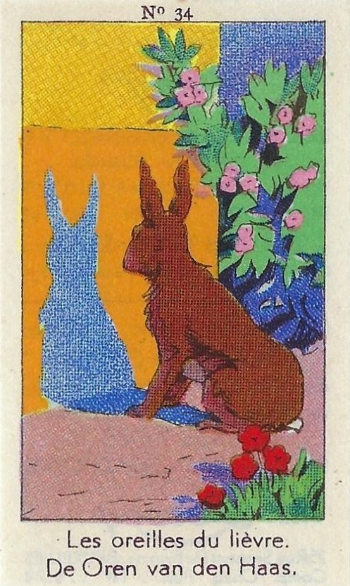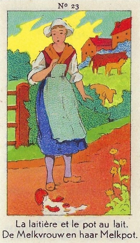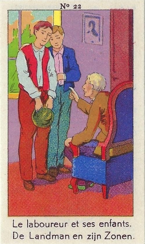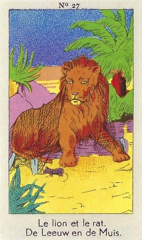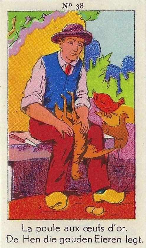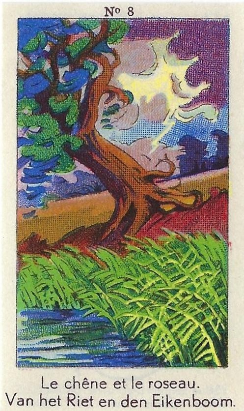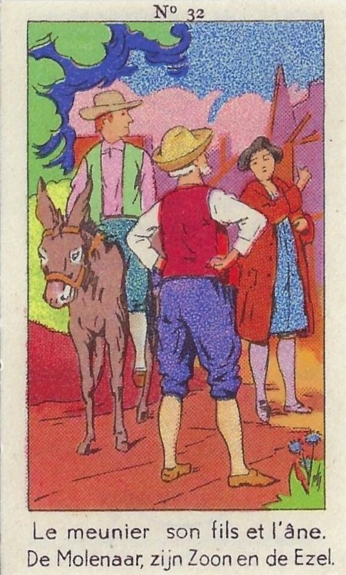 1930? Fifty numbered small⅝ slips (identified on the verso as "Chromos" on both languages) 1⅝" by 2¾" featuring La Fontaine's fables with titles in French and Flemish. Each verso has identical French and Flemish advertisements for Lecocq chocolate and candies and mention of albums in which to put these fifty chromos. AU$17.50 from 191Scazna through Ebay, August, '20.