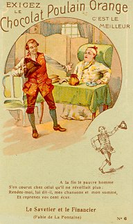 1890? 7 French cards of La Fontaine fables from Chocolat Poulain Orange. 2½" x slightly more than 4". Imp. A. Norgeu, Paris. $28 from Bertrand Cocq, Calonne-Ricouart, France, March, '01.