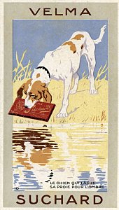 Some of these cards still have the feel that the powder with which they came is still on them. Strong colors and simple forms mark these cards, which are quite different from the more traditional Suchard landscape cards. The identifying numbers between "1" and "12" can be hard to find but they are there in the corner of the image segment.