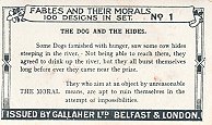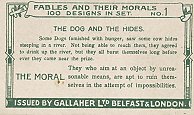 Fables and Their Morals. 100 Designs in Set. Issued by Gallaher Ltd., Belfast & London. Gallaher issued apparently three sets of 100 cards, 1½" x 2½". The illustrations, nicely detailed for their size, are identical in each set. The picture side always features "Gallaher's Cigarettes" and a block-print title on the colored picture, with "Copyright" in the lower right corner. The design of each set's verso differs slightly. One finds the title of the series, a title, a fable text, a moral, and a bold strip at the bottom proclaiming "Issued by Gallaher Ltd., Belfast & London." Below is a copy of a verso from each set and hover hover-buttons to view the common pictures in groups of ten. My prizes among the illustrations go to these cards: #41. The Horse and the Ass, #43. The Field of Treasure, and #71. The Vain Jackdaw. At least "The Ass and His Driver" (#38) and maybe more illustrations are taken from Tenniel.