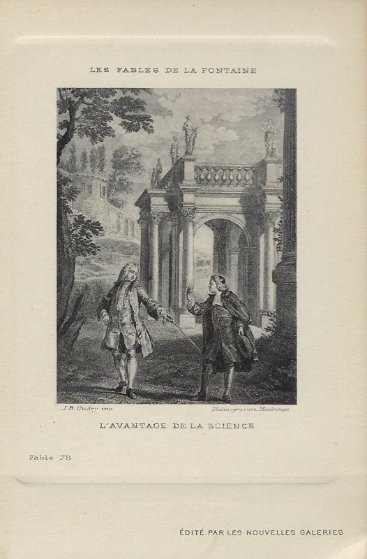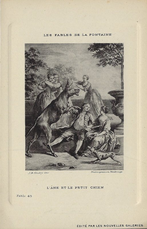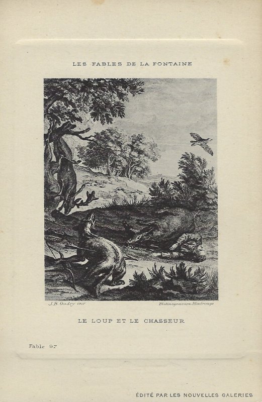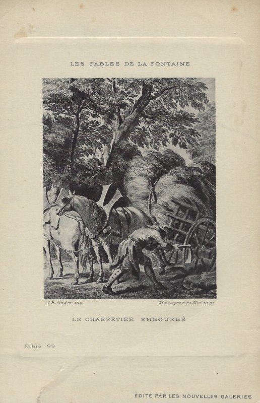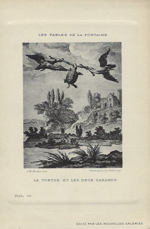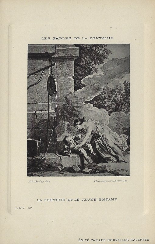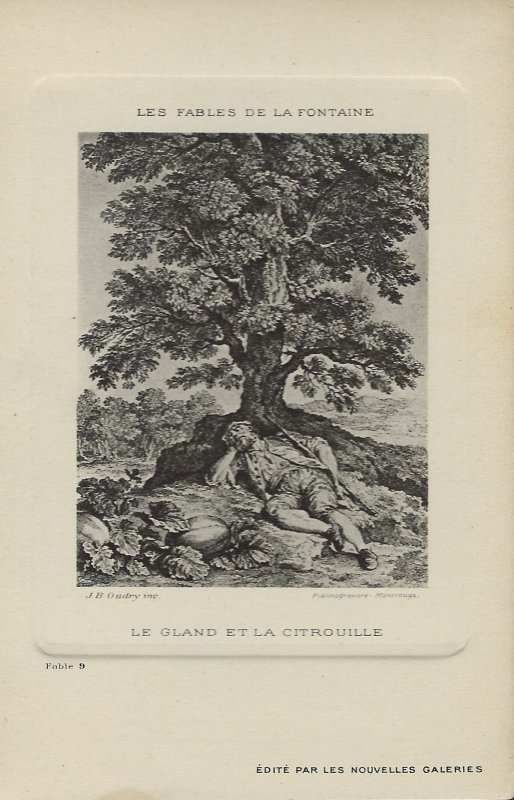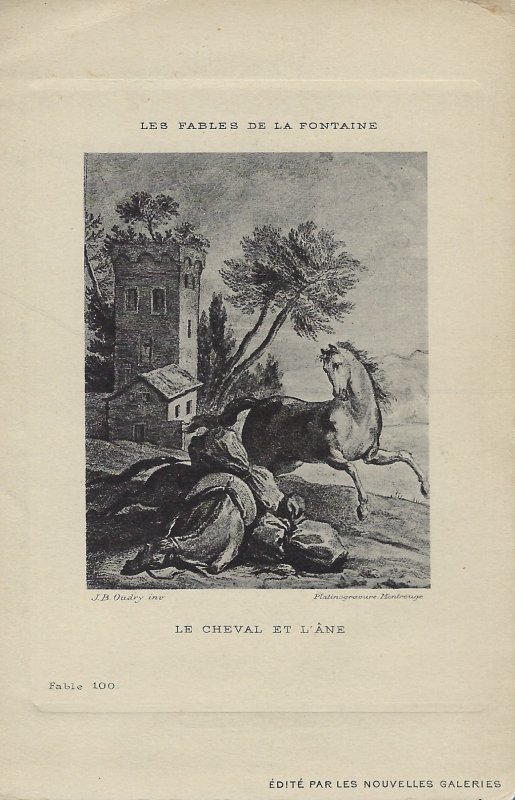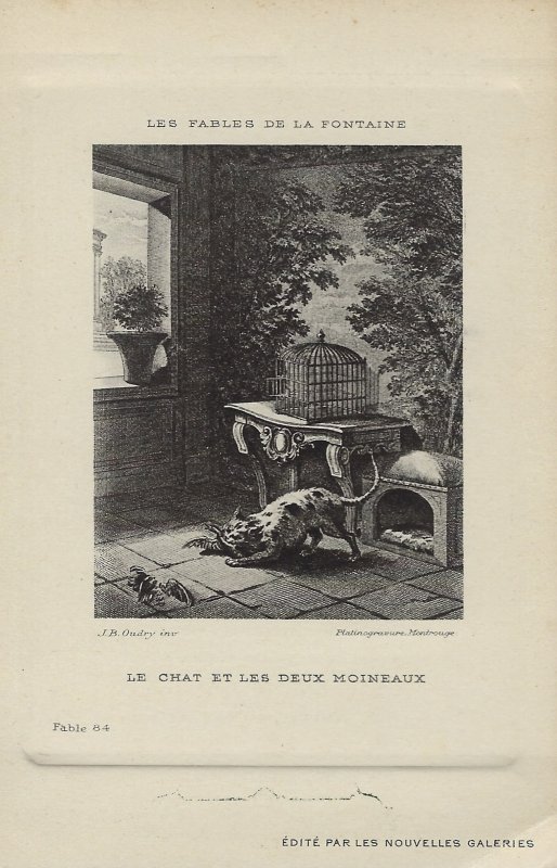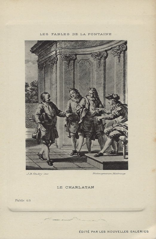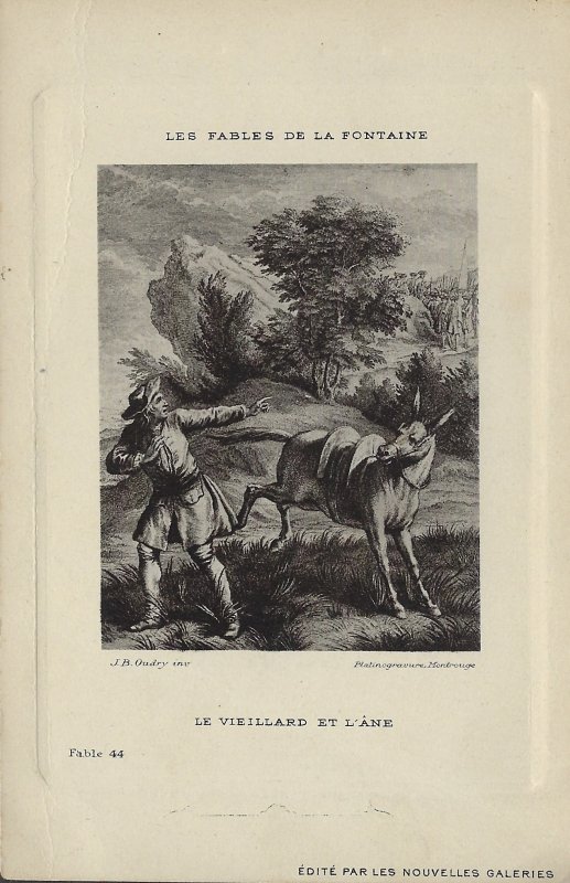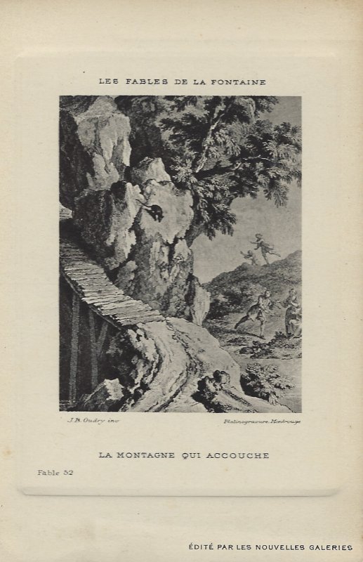 1935? Complete set of 100 numbered cards presenting Les Fables de La Fontaine as engraved by J. B. Oudry. "Edité par les Nouvelles Galeries." ?300 from Bertrand Cocq, Calonne Ricouart, France, Sept., '20. Four cards earlier for $2.50 from Sally Carver, Warwick, RI, through eBay, Jan., '14. And 32 cards for $128 from Livres Anciens and Books, La Madeleine, France, through Ebay, April, '21. A second complete set minus card #92 for $70 from Thomas Famulary, Rumson, NJ, through Ebay, March, '22.