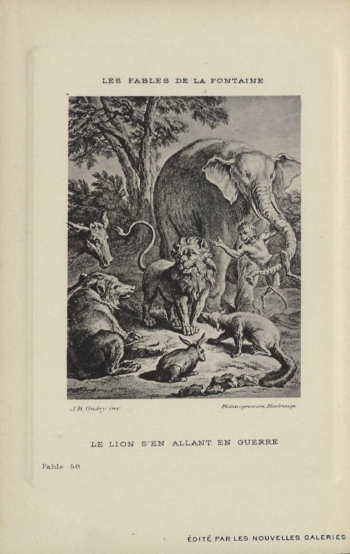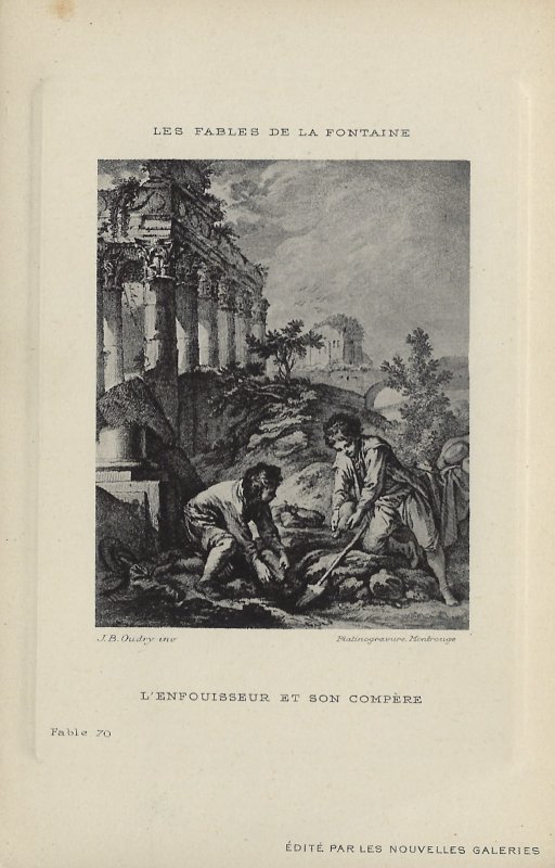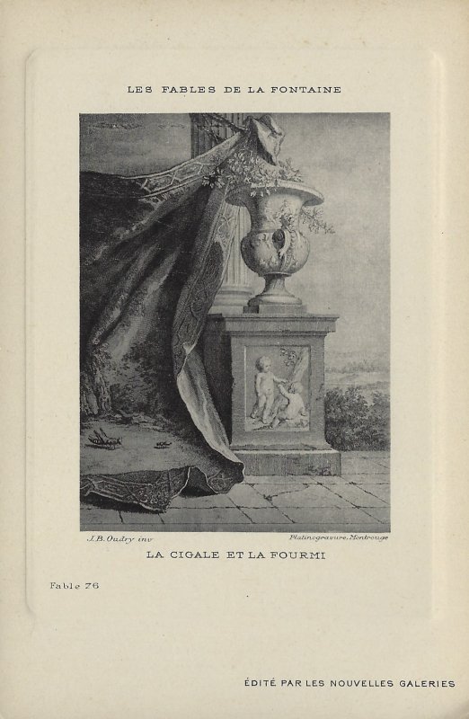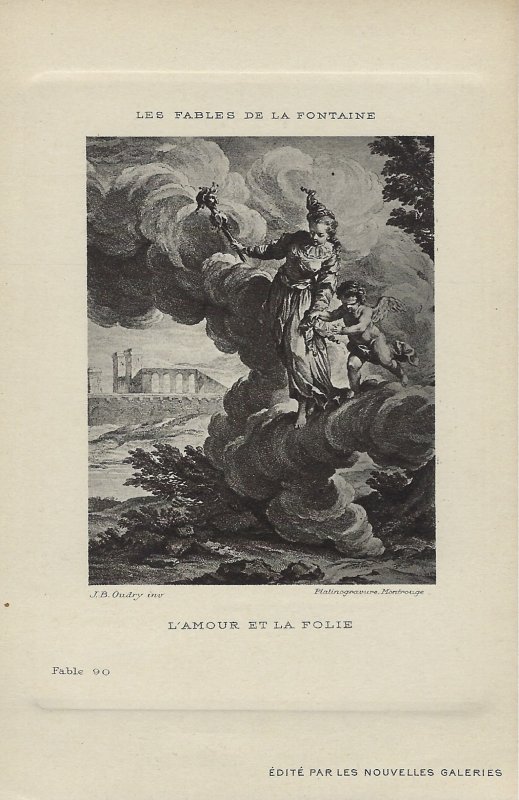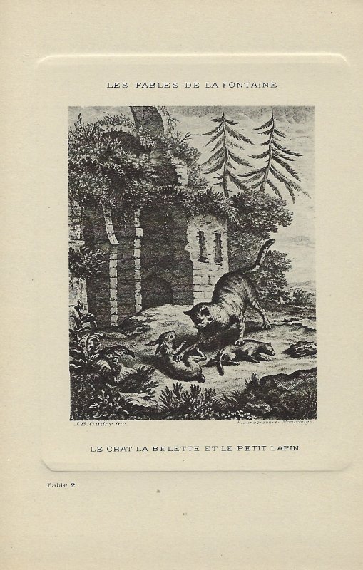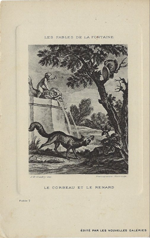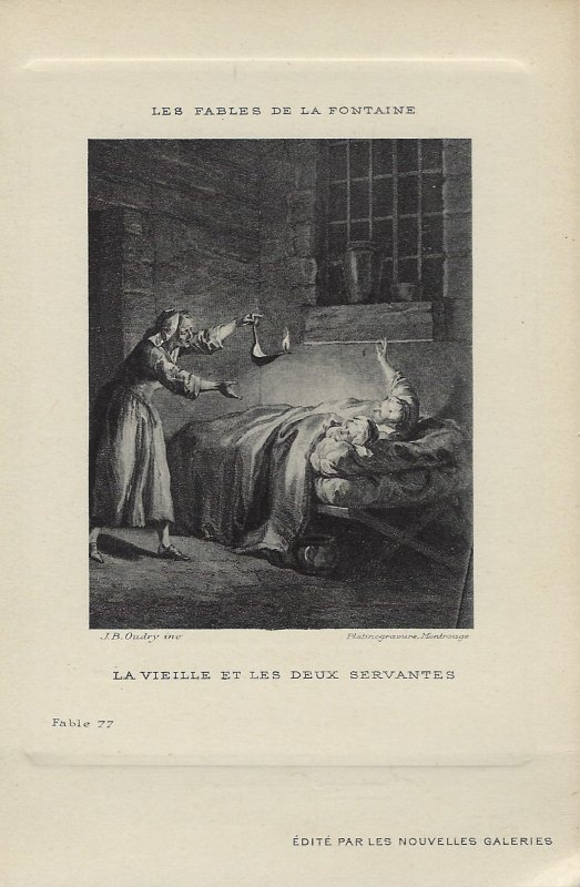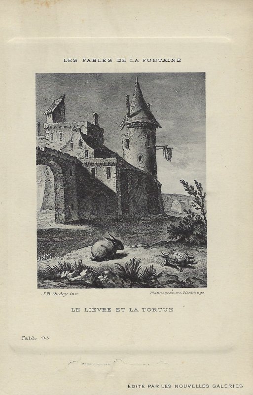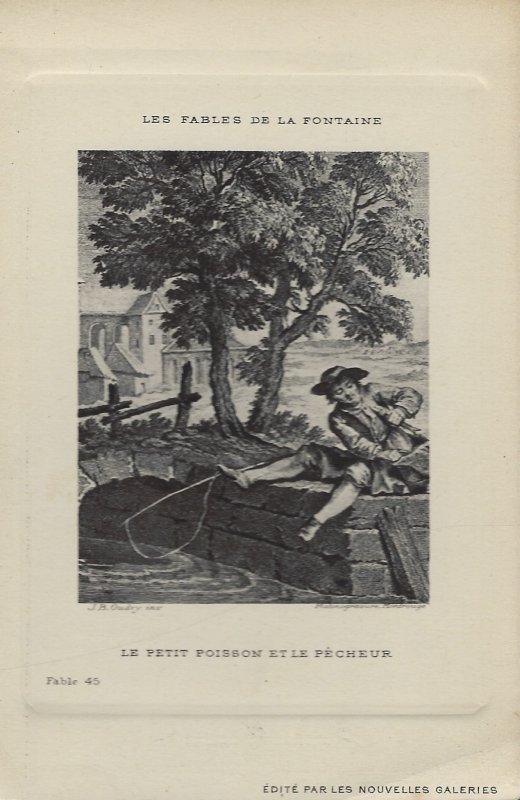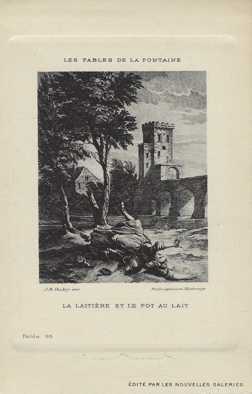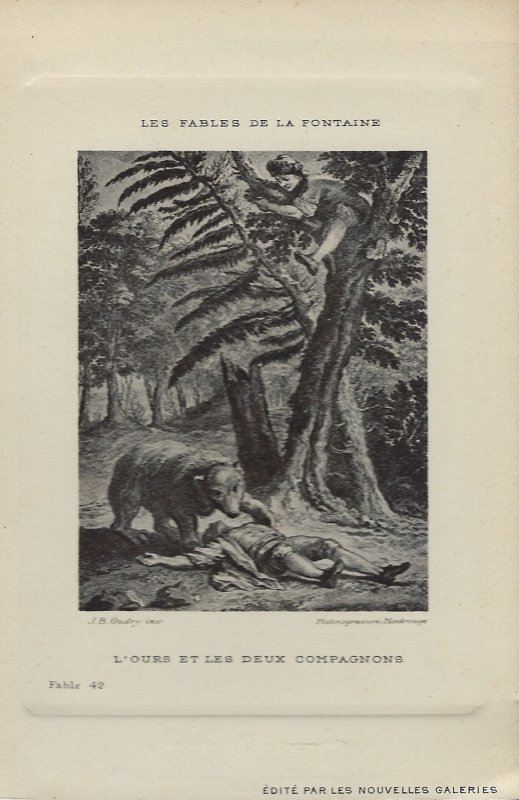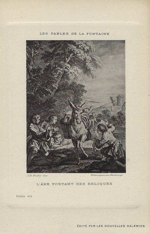 1935? Complete set of 100 numbered cards presenting Les Fables de La Fontaine as engraved by J. B. Oudry. "Edité par les Nouvelles Galeries." ?300 from Bertrand Cocq, Calonne Ricouart, France, Sept., '20. Four cards earlier for $2.50 from Sally Carver, Warwick, RI, through eBay, Jan., '14. And 32 cards for $128 from Livres Anciens and Books, La Madeleine, France, through Ebay, April, '21. A second complete set minus card #92 for $70 from Thomas Famulary, Rumson, NJ, through Ebay, March, '22.
