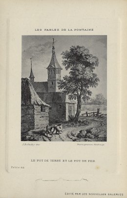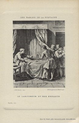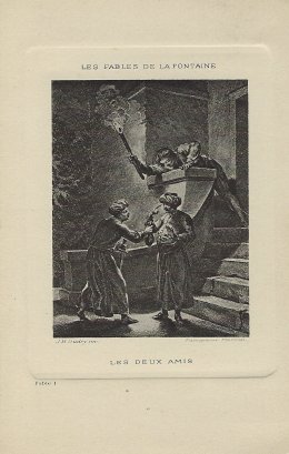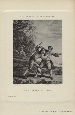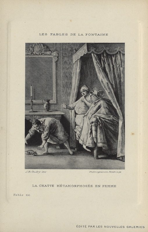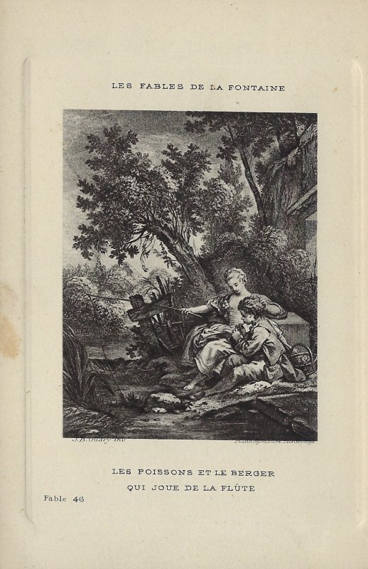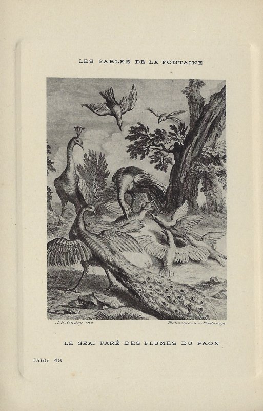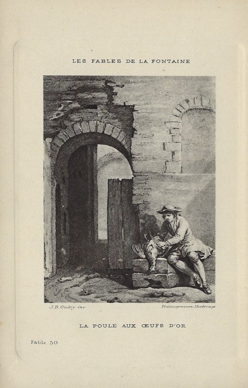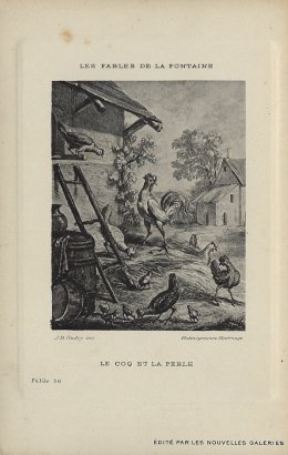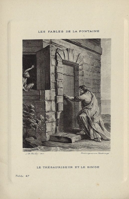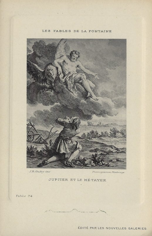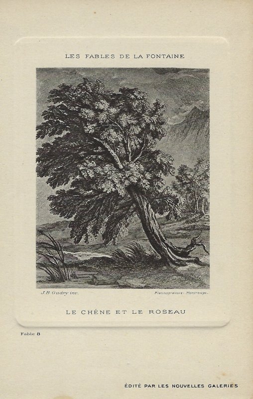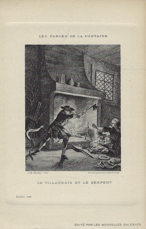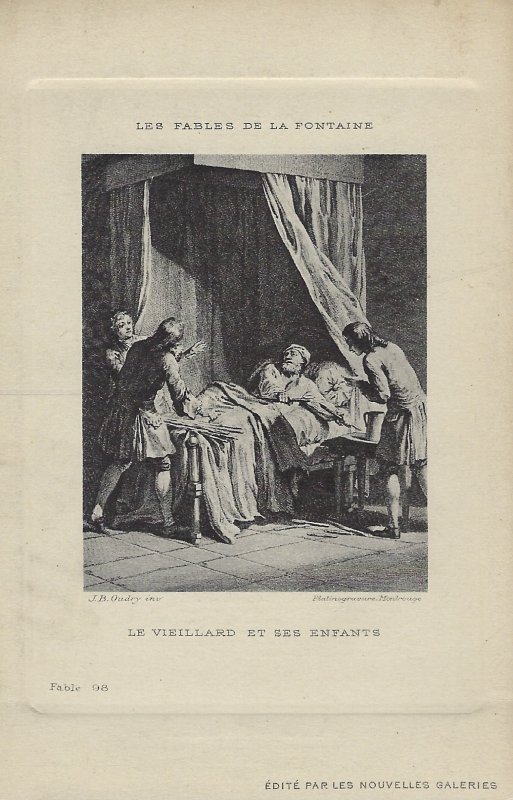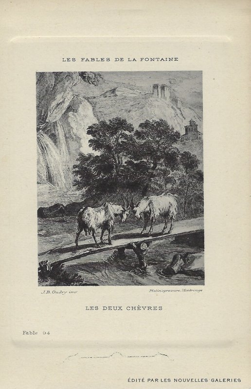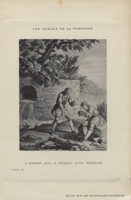 1935? Complete set of 100 numbered cards presenting Les Fables de La Fontaine as engraved by J. B. Oudry. "Edité par les Nouvelles Galeries." ?300 from Bertrand Cocq, Calonne Ricouart, France, Sept., '20. Four cards earlier for $2.50 from Sally Carver, Warwick, RI, through eBay, Jan., '14. And 32 cards for $128 from Livres Anciens and Books, La Madeleine, France, through Ebay, April, '21. A second complete set minus card #92 for $70 from Thomas Famulary, Rumson, NJ, through Ebay, March, '22.