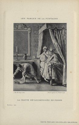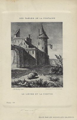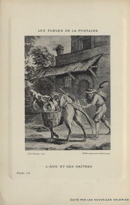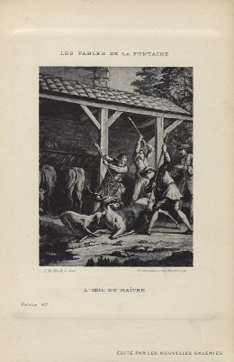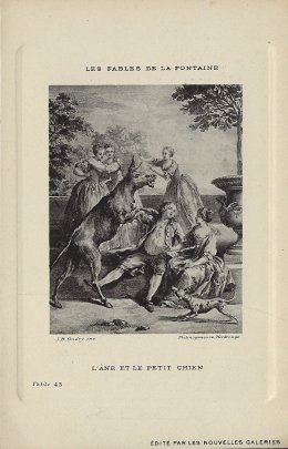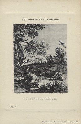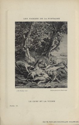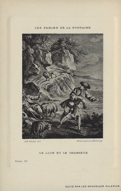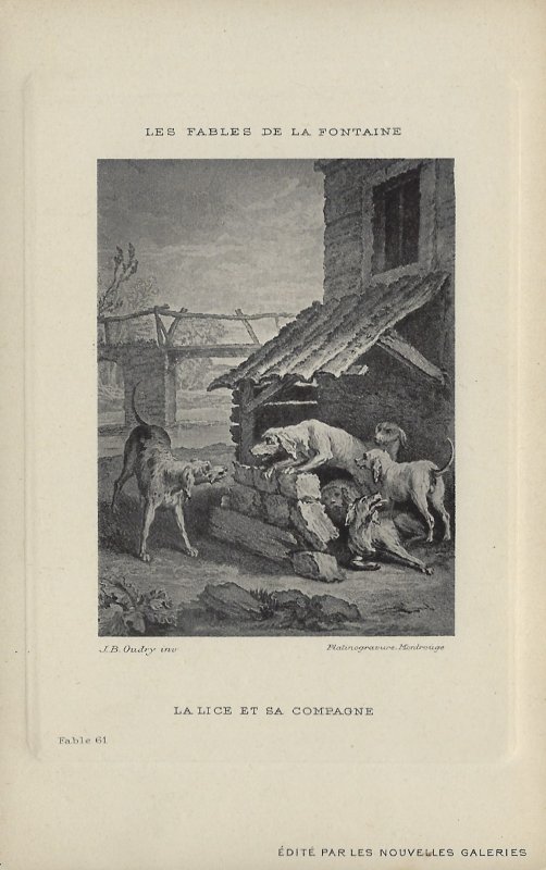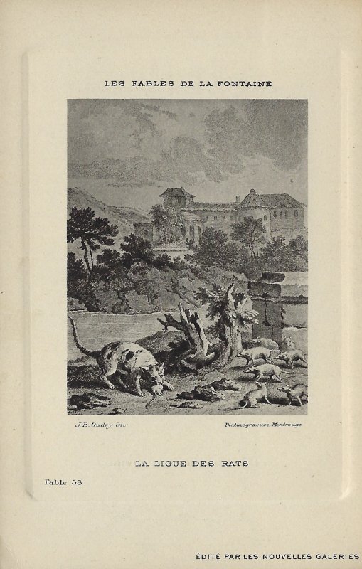 These are high class renditions of Oudry's work on very fine cards slightly larger than 4½" by 6 ½". The printing of the image indents that portion of each card. The verso has title, text, "La Fontaine," and "Edition des Nouvelles Galeries," Nouvelles Galeries seems to have existed in Angers, Saint-Denis, and Besançon. Cards #46 through #50 of the first set and cards #1 through #6 of the second set drop the line at the bottom of the image side: "Edité par les Nouvelles Galeries." One card in the first set (#87) has that phrase and a street address on Boulevard Bonne Nouvelle.