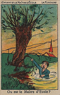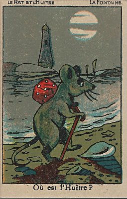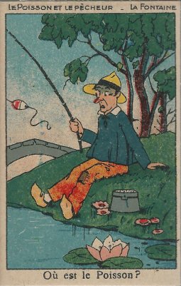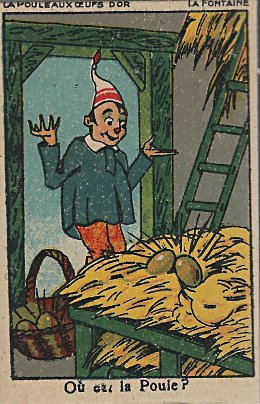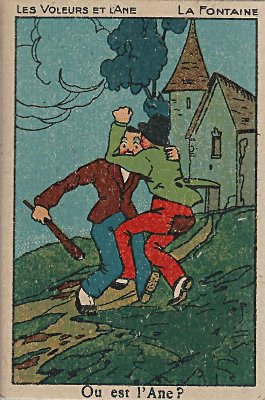 1950? 10 colored French Guessing Game cards. "Les Belles Devinettes." 2½" x 4". 10 fables of La Fontaine, who is mentioned after each fable title at the top of the card. €10 from Grenadines Sari, Paris, through eBay.