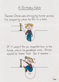 1995? "A Birthday Fable." Portrait formatted cartoon birthday greeting card. The front shows a farmer standing in a ditch and holding a ball of string and then climbing out of the ditch. The front's prose leads up to an outrageous play on words revealed when the card is opened. Dale Cards B-032785. RPP, Inc. 2 copies, gifts in '97.