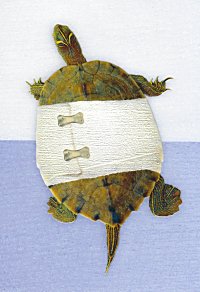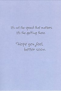 2000? Hallmark get-well card. Cover shows a bandaged turtle. Inside: "It's not the speed that matters. It's the getting there. Hope you feel better soon." Gift of Pauli Ruotolo, July, '05. A clever card like this does not even have to repeat "Slow and steady wins the race." We all know the idea, and the sight of the turtle calls it up quickly. As ever, Hallmark is clever.
