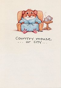1991? Portrait-formatted colored painting get-well card. The front shows a mouse in a robe, with slippers on its feet and a steaming pot of tea at its side. "Country mouse…or city…" reads the outside caption, to be finished inside with "Happy Healing!" Ambassador: Hallmark 135ZF 323R. Gift of Vera Ruotolo, July, '92.