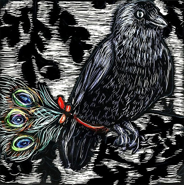 The artist here chooses to add minimal color accents to a heavily black image. This choice of coloring underscores beautifully the crow's dissatisfaction with his black-and-white-and-no-color image. The added color seems foreign. Lovely work!