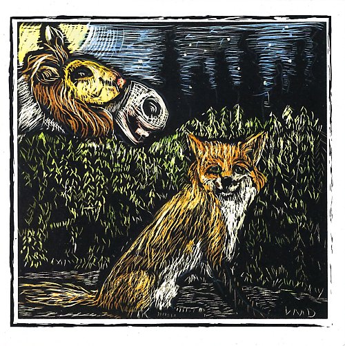 This visual version highlights the fox who noticed ears protruding or bellowing rather than roaring. The fox's face suggests alertness. The massive snout hanging out from the lion's-head disguise suggests something about the donkey. Colorful and well done!