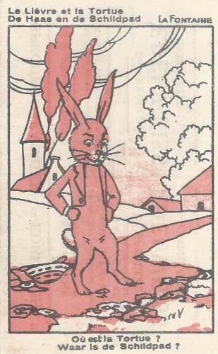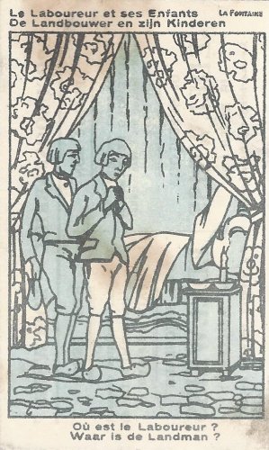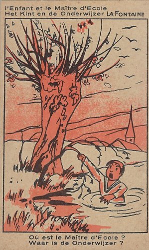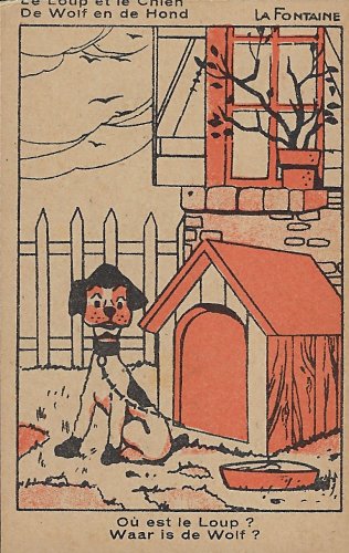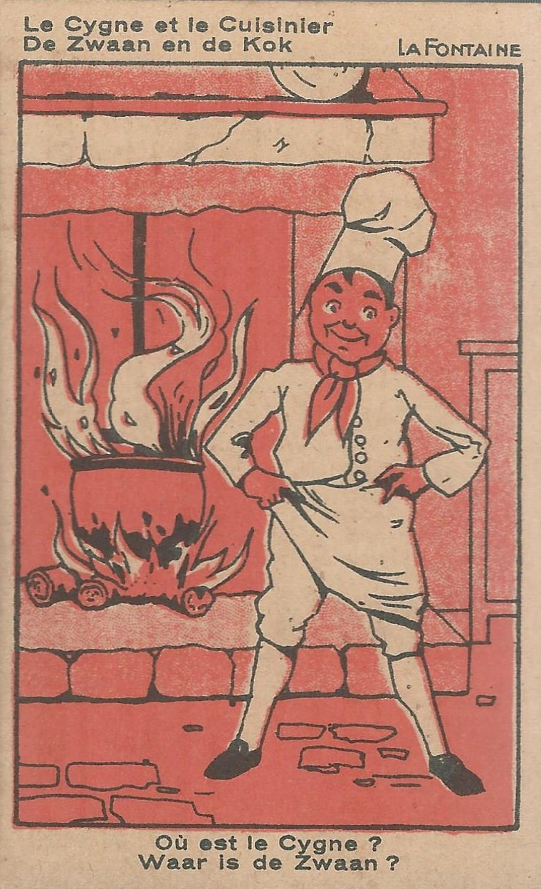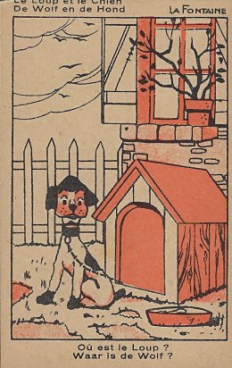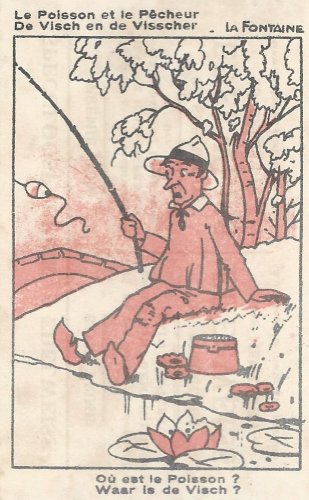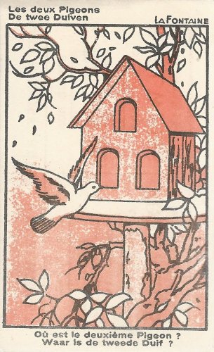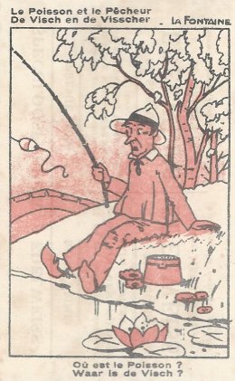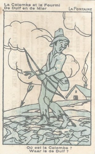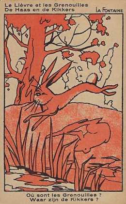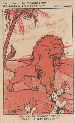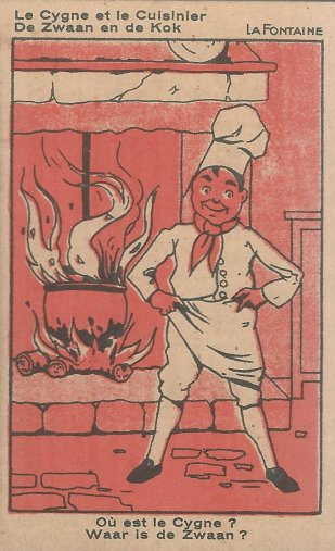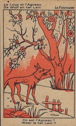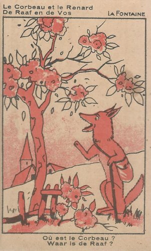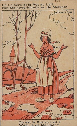 1950? Six monochrome cards 2½" x 4¼" displaying La Fontaine's fables with bilingual titles and hidden-picture questions. Each advertises "Mono Poeders" in Dutch. $7 each from Bertrand Cocq, Calonne Ricouart, France, Sept., '20. And 11 cards advertising "Speculoos Edelweiss" from Ann Filipowich, Toronto, through eBay, Feb., '15.