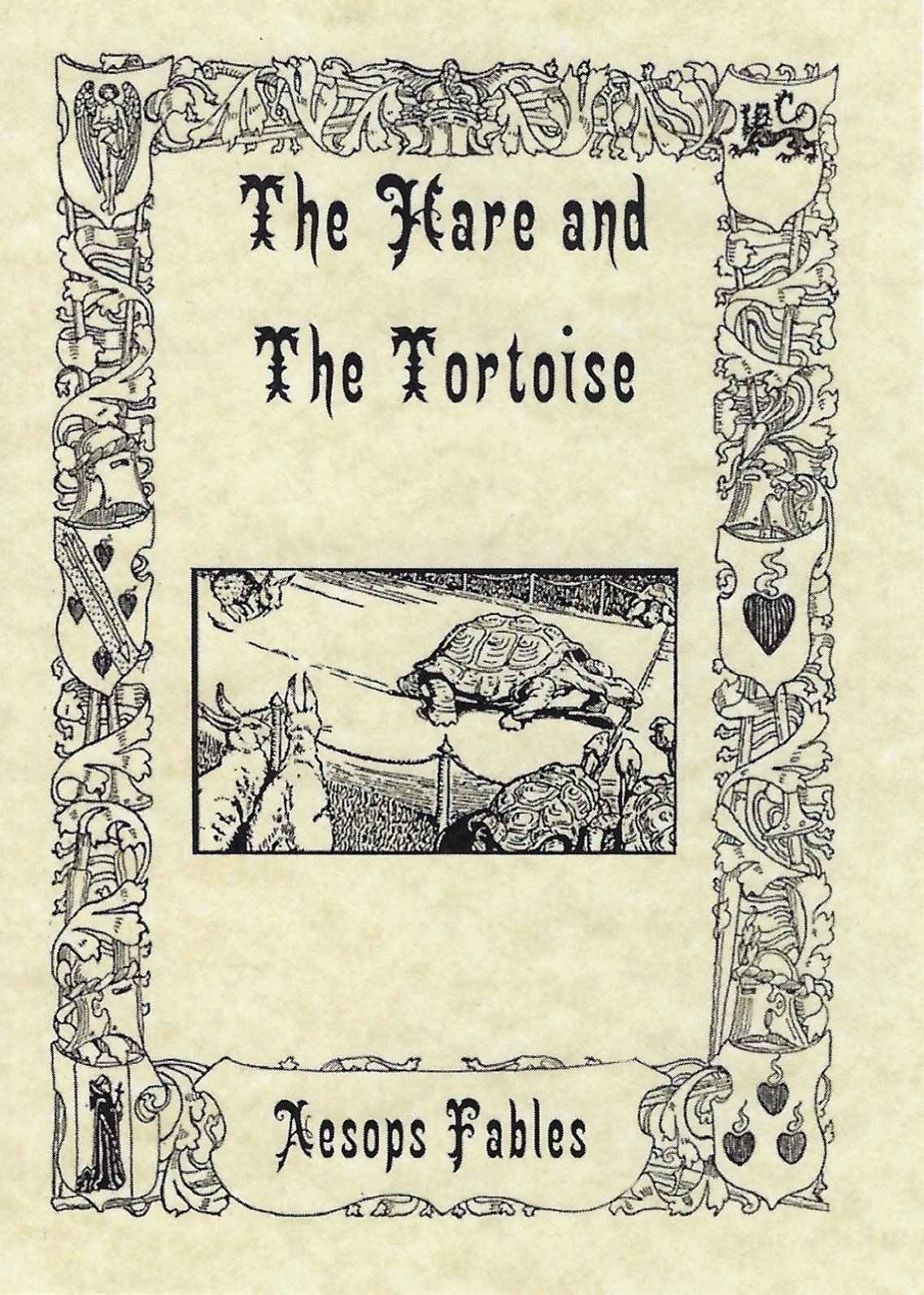 An ornate border encloses the fable’s title, a black-and-white vignette of the race’s finish, and “Aesop’s Fables.” I cannot identify the artist here. Blank verso. Nicely boxed.