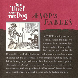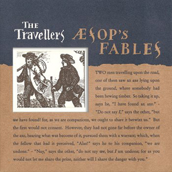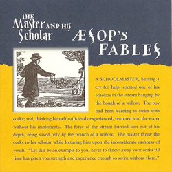 1997 "The Fables of Aesop." Eight cards by World's Greatest Minds Ltd, England. Each card has a window opening on a reproduction of a classic fable illustration. The outside of the card, around the window, presents the text of the fable. The inside presents the application. Stories and applications are taken, in slightly edited form, from Croxall. Gift of Maureen Hester from the Palace of the Legion of Honor, San Francisco, August, '97. Several extra copies. Click on any card to see a larger image.