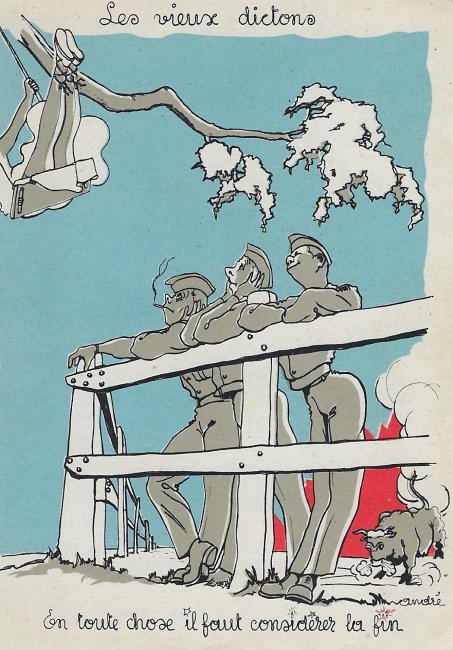 1955? Portrait three-colored humorous postcard showing three soldiers at a fence well below a young woman on a swing. "En toute chose il faut considerer la fin. Artist: André. CAP: Les vieux dictons. Cie des Arts Photomécanique. $6 from Bertrand Cocq, Calonne Ricouart, France, Sept., '20.