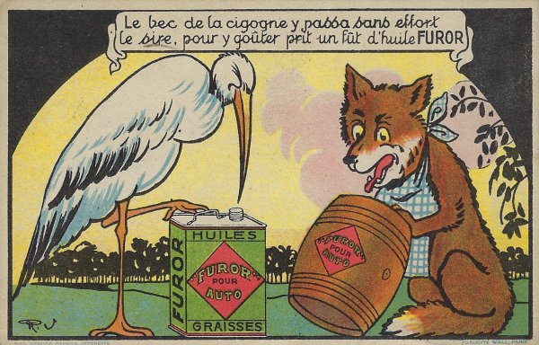 Bertrand describes the card as rare. The fox speaks: “The stork’s beak passes without effort here, Sir, but to taste itit takes a barrel of Furor Oil!” I wonder if “appreciate” might be a better translation of “gouter” here. The cartoon-work and the approach reminds one of Benjamin Rabier.