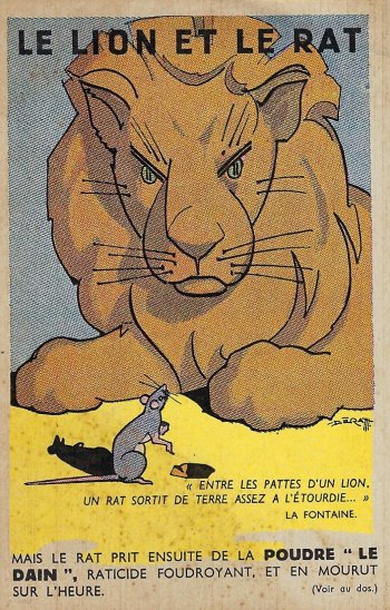 1960? "Le Lion et le Rat." Advertising postcard sponsored by Poudre "Le Dain," rat poison, and sent by Au Père Cafard in Paris. Artist is something like "Derattt." Gift of Susan Carlson, Dec., '23.