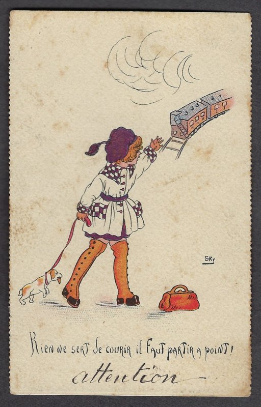 1920? Colored cartoon postcard of TH. “Rien de sert de courir il faut partir a point!“ A girl with dog and satchel is late for the train disappearing in the distance. “5Ky.” $6 from Bertrand Cocq, Calonne-Ricouart, France, Sept., ’20.