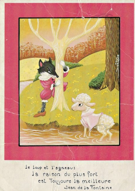 The cuteness of the lamb only underscores the brutality of the moral stated here. There is a message on the verso.