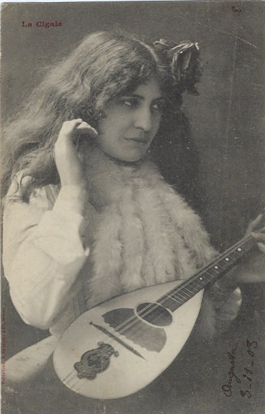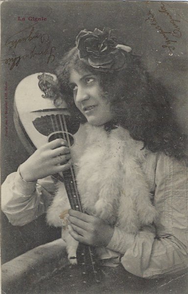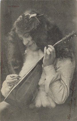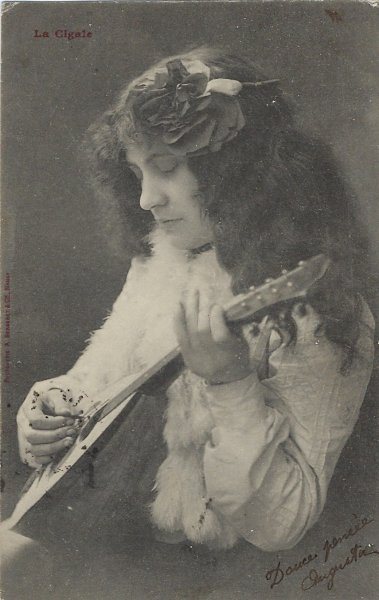 I have sometimes hesitated to include materials identified simply as "Cigale" since I have wondered if they necessarily refer to La Fontaine's first fable in Book 1. I am happy to accept Bertrand's judgment on this curious set. Is this something of a French "girly" photograph crossing over into a fable category? Can one really play the mandolin in all those different positions?