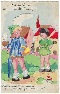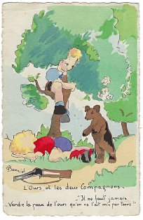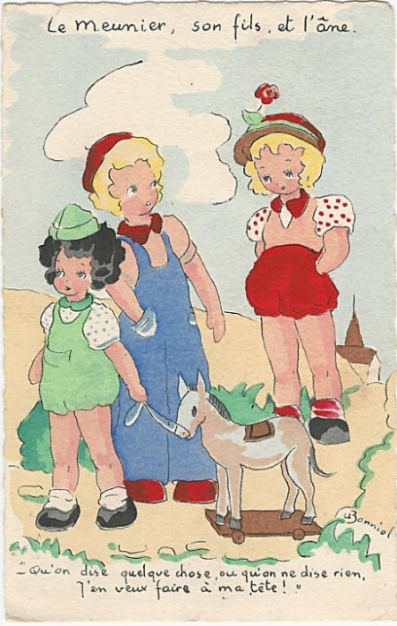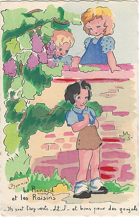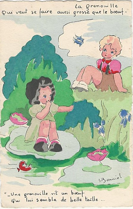 1944? Eight cards showing children fulfilling the roles of La Fontaine's fables. Signed by "L (?) Bonniol." Imprimé en France. Éditions Superluxe-Paris. "Oyster and Litigants" for €5 from Suzanne Botti, Le Bono, at the Paris Post Card Exhibition, Jan., '05. WL for €4 at the Paris Post Card Exhibition, Jan., '05. The other six a gift of Bertrand Cocq, Calonne-Ricouart, France, August, '15. Now, in Sept., '19, two last cards (TB and TMCM) for $14 from Bertrand Cocq, Calonne Ricouart, France, along with an extra copy of TB for $8. Four further cards as part of a group for $1.10 each from yvrl through Ebay, May, '22. "Acorn and Pumpkin" for €10 from Albert van den Bosch, Antwerp, June, '23.