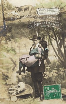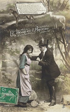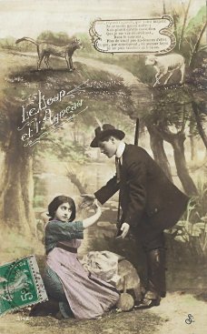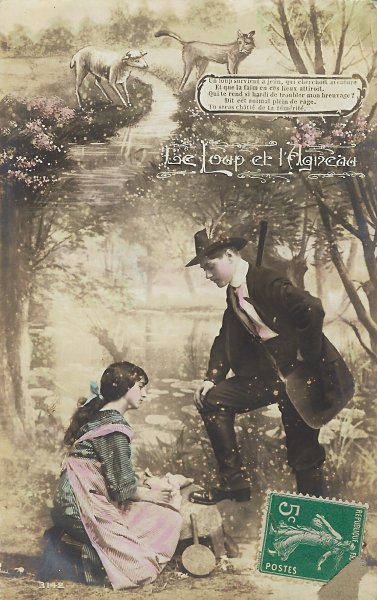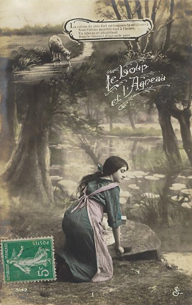 Each picture in this set plays out in front of the same photographic background of trees at a riverside. At the top of each card is a literal artistic picturing of the animal story, from the lamb's drinking to the arrival of the wolf, to a threatening confrontation, to the lamb's answer, and finally to the forceful dragging off of the lamb. The title serves as a marker between this drawn scene above and the photographic human scene below. Do I understand correctly that she is washing clothes and that he is a hunter? In the last scene, is the woman resisting? This set of photographic postcards is curious for its red and blue coloring. I suspect that the "Chloro-Platine" process advertised has something to do with that coloration.