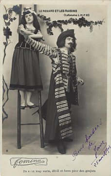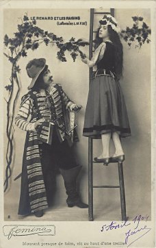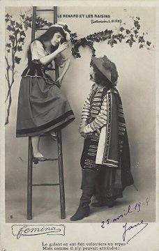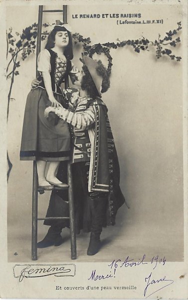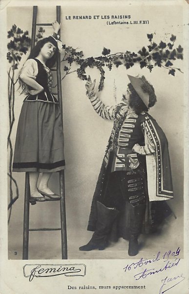 Do I read this series wrong by understanding it to portray a romantic relationship that does not turn out as the initiator desires – and so he rejects it? Notice that the sender dates his five cards in April on the 5th, 16th (twice), and 25th (twice). Was he trying to suggest something to Mademoiselle M.L. Pouchan in Pau? Did she come down from her ladder? "Femina" has a distinctive cursive signature, clear on each of these cards, for its publications in the early 20th century, apparently between 1901 and 1910. It fascinates me to figure out what a feminist publishing house is communicating by presenting this fable with this interpretation!