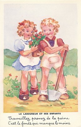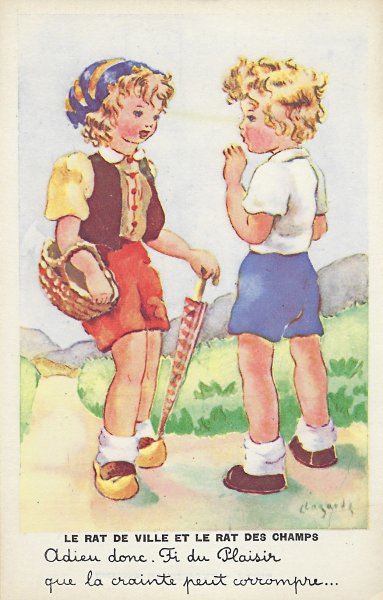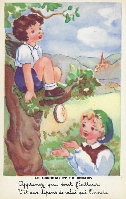 1950? Eight colored painted postcards (out of a set of ?) signed by Jeanne Lagarde and presenting children in situations recalling La Fontaine's fables. Paris: Editions Superluxe. Printed in France. $40 from Bertrand Cocq, Calonne Ricouart, France, Sept., '18. Extra copy of FC for €6 from Dominique Chapelon, Yronde et Buron, at the Paris Post Card Exhibition, Jan., '05.