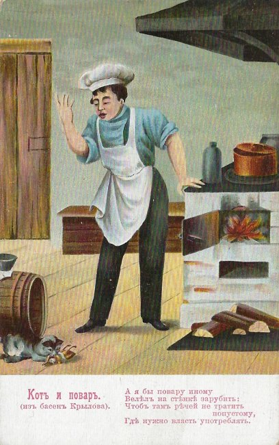 1930? Five postcards featuring colored images of Krylov's fables along with a short title and citation from the poem against a white background. €5 from Bartko-Reher, Berlin. June, '24. Three more for €5 each from Bartko-Reher, Berlin, Nov., ''24.