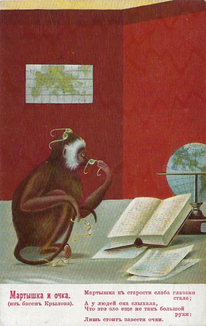 A monkey with failing eyesight hears that glasses help. She gets classes and puts them on her tail, licks them, puts them on top of her head -- and finally declares them useless.