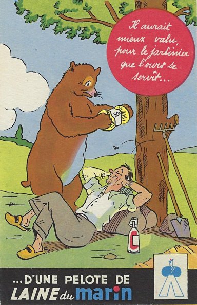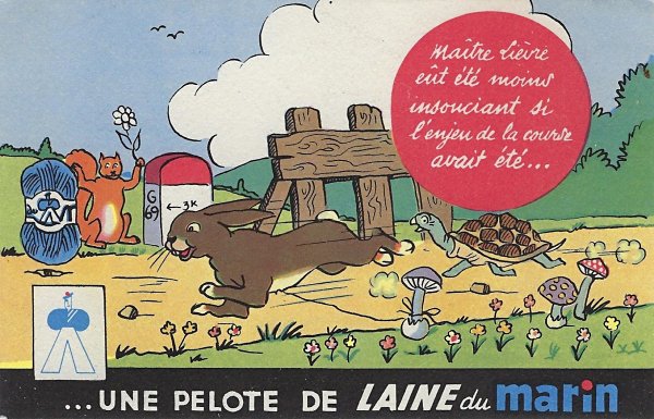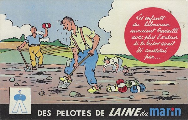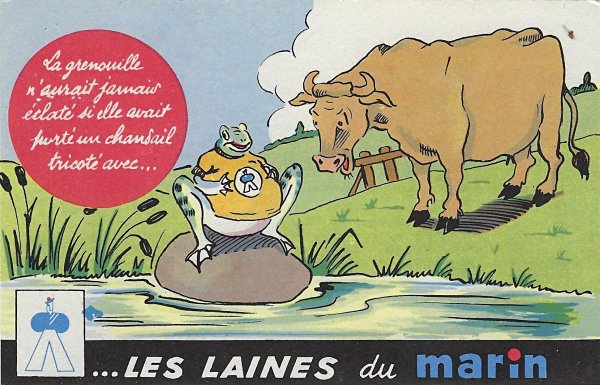 1935? Laines du Marin ("Sailor Wool"). Complete set of twelve colored postcards using La Fontaine's fables to advertise this brand of wool. $100 from Bertrand Cocq, Calonne Ricouart, France, Sept., '20. Duplicate of TH for €5 from Akpool, Berlin, June, '20.