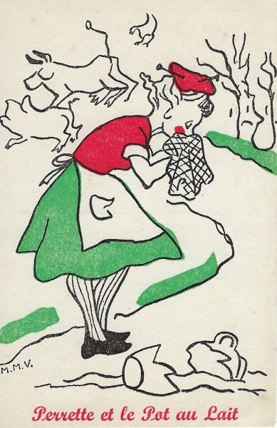 The artistry in these cards is surprisingly similar to that in the series done for the “Semaine Nationale de l’Enfance.” The verso of each card has a pointed remark to the reader drawn from the fable and the campaign. For MM it is “Would you have bought Perrette a new pot?” and for FS “Do not fool your children if you want to keep their trust.” I have found one other card on the web and hope to add it to the series. Perhaps Bertrand can find me the rest of the series, however large it may be!