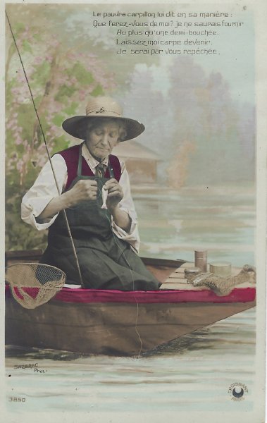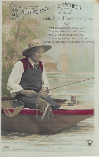 1910 “Le Petit Poisson et le Pécheur: Fable de La Fontaine.” Complete two-card set of colored photographic postcards. “Croissant Paris.” “3850.” Complete colored series of 2 portrait postcards photographed by Sazerac (“Sazerac phot.”) and published by Croissant in Paris. $5 each from Bertrand Cocq, Calonne Ricouart, France, Sept., '20.