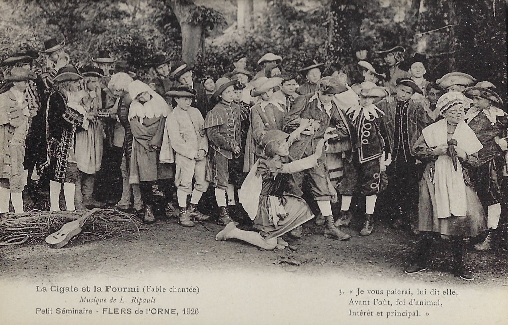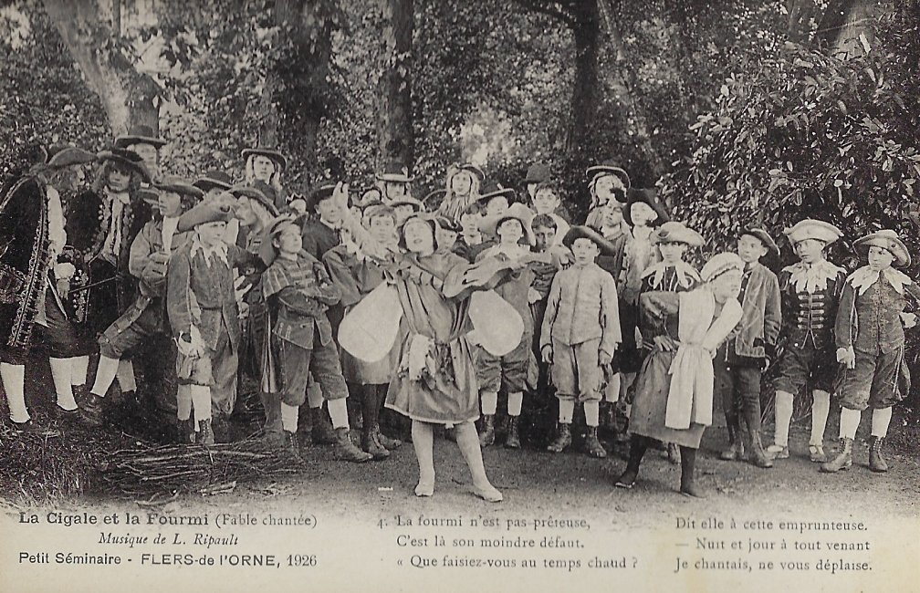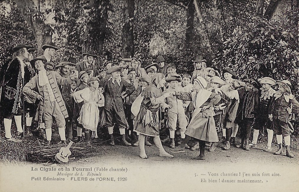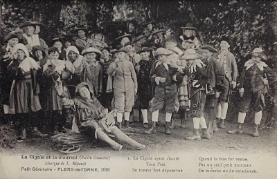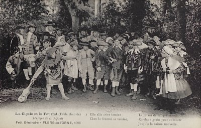 The six numbered photographic postcards show the cast at six moments in the presentation, marked by a portion of text from La Fontaine's fable. The scenes show summertime singing, wintertime hunger, pleading for food, declaration by the grasshopper of singing for the pleasure of any listener, rejection by the ant, and "Choeur Final." Blank versoes.