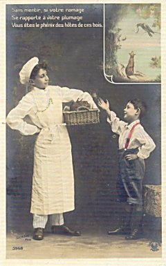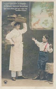 The human story is utterly consistent with the fable, as a child sees bakery in the tray on the baker's head and flatters him to get some of the bakery. As in the "Croissant" version of TH, there is a portion of each card's picture given to a colored rendition of the original fable, the first of them announcing the title. These three cards present the first nine lines of La Fontaine's fable, and thus I have labelled them Cards #1 through #3 of the set. Are these cards hand-tinted? The coloring of FC in the upper right of Card #3 is particularly nice.