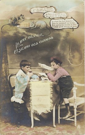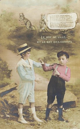 My, there was lively competition in the early twentieth century in Paris in producing colored photographic postcard series of fables! The piling on of specifications in that last sentence surprises even me! This set is closest to Chloro-Platine WL and shares the same symbol, "SE," in the lower right corner. As that set has the number 3142 on each card, so this set has 3127. That is a five-card set, apparently complete, and I believe that this four-card set is missing a third card in the middle, especially because those four verses are the only ones left out of the fable on the cards we have. Here, as there, we have lovely coloring distinguishing the two "mice" as they are played by children. How was that coloring done at the printer's? Especially fetching in this presentation, I believe, is the scene of the two mice devouring the city banquet! Now to find that fifth card! All four were sent in 1918 to the same "Cher Cousin Alfred Pepin" (?) in "Secteur 125."