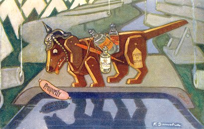 E1. "The Dog and the Shadow." A wooden dog in Kaiser helmet labeled "Made in Germany" drops a sausage labeled "Prosperity" into water, in which is reflected a sausage labeled "World Dominion." The card's own explanation: "Germany has lost the prosperity she had so laboriously acquired, in the vain endeavour to obtain the mastery of the world." Series title: "Aesop's Fables Up to Date." $11.17 as part of a complete set from Susan Brouwer, Hesperia, CA, through Ebay, July, '00. Extra exemplars for $25 from Dick Lightle, Shawnee, KS, Sept., '99, and, in slightly poorer condition at Sacramento Paper Fair, Dec., '96. Extra for $10 from Barbumer6, Jenkintown, PA, through eBay, March, '04.
