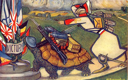 F1. "The Hare and the Tortoise." In this parody of TH, a large helmeted turtle with a number of countries' names written on its back ("Japan, Belgium, England, France, Russia") arrives before a German-coated rabbit at a flag-festooned memorial labeled "Victory." While the Allied turtle has weapons galore on its back, the German rabbit has a few small satchels labeled "Lies," "Poison," and "Asphyxiating Gases." Series title: "Aesop's Fables Up to Date." $11.17 as part of a complete set from Susan Brouwer, Hesperia, CA, through Ebay, July, '00. Extra exemplars for $11.25 from Carolyn Nimmer Dias through Ebay, March, '99; for $7.50 from Philip Weyland, Downey, CA, through Ebay, Nov., '01; and for $8 from Scott Zagoria, Arcata, CA, through Ebay, Sept., '01. Extra for $10 from Barbumer6, Jenkintown, PA, through eBay, March, '04.
