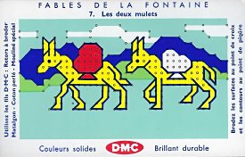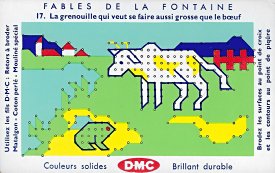 1965? Set of 20 embroidery stitching cards plus four extras. Complete set. Fables de La Fontaine. Numbered 1-20. DMC $28.68 from Boulot Dodo, Avignon, France, through Etsy, Jan., '19. Thirteen duplicates for $94 from Bertrand Cocq, Calonne Ricouart, France, Sept., '18.