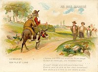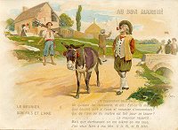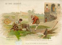 Each of the six scenes here has a four-to-seven line segment of La Fontaine's long fable. Again, as in the GA set, "Au Bon Marché" and the title of the fable are to be found somewhere on the picture side. The back has the same information as there including mention that this store is "comme l'une des plus remarquables curiosités de Paris." Several of the cards show crease-marks or the residue of a scrapbook on their backs.