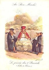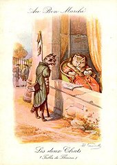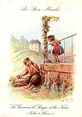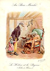 1900? Fables de Florian. J.J. Grandville. Eight cards, just over 6¼" x 4½", advertising Au Bon Marché, presenting fables of Florian and illustrated in color by J.J. Grandville. Engraved by H. Demoulin and printed by Draeger Frères. From Annick Tilly at the Clignancourt flea market for about 50 Francs each, August, '99 and July, '01. "Le Linot" for $14 from McIaren Enterprises, Nottingham, England, through Ebay, August, '00. "La Tourterelle et la Fauvette" for €3 at Paris Post Card Exhibit, Jan., '05. Extras of "Les deux Chats," "La Guenon, le Singe et la Noix," and "Le Hibou et le Pigeon," the latter cropped.