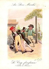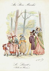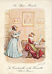 Each card lists "Au Bon Marché" at the top of both front and back. The front of the card then presents a delightful Grandville scene, including the usual dressed human animals. Under Grandville's signature is a title for the fable scene and, in parentheses, "Fables de Florian." The back identifies Au Bon Marché as "Maison A. Boucicaut" in Paris, restates "Fables de Florian," and lists the engraver and printer under the full text. A note on the back of one of the cards from Annick indicated that there are six in the series. Now that--having found "Le Linot" and "La Tourterelle et la Fauvette"--I have eight, that remark seems to have been premature. While all the illustrations are done in portrait format, half of the texts are in landscape format.