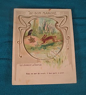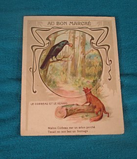 I am delighted to learn that there is a set of popups by BM. I had thought that their FG was a one-off. This FC is another exquisite pop-up in very good condition. The front card is cut on the lower 75% of the circle enclosing the upper portion of the picture, so that a viewer discovers that the front page opens up. When it does, he or she sees a three-dimensional scene. In the background is the name of Au Bon Marché. In the middle ground is a group of four smiling cooks. In the foreground is a distinguished looking speaker in front of a table. Is he flattering them? At any rate the couplet beneath the picture contains La Fontaine's warning that every flatterer lives from the person who listens to him. To see how the pop-up works, click on it.