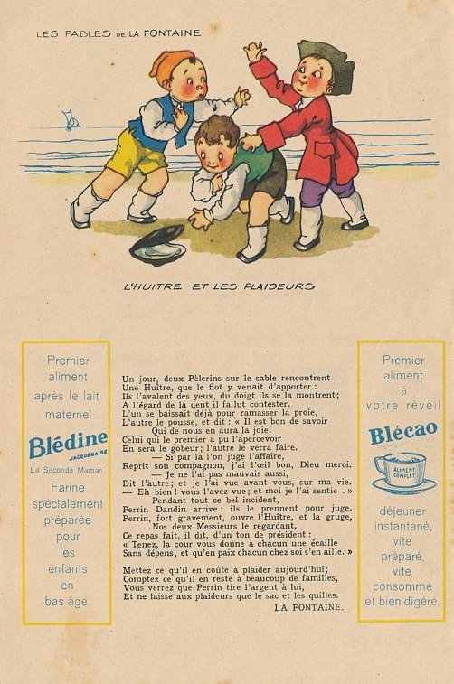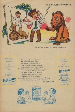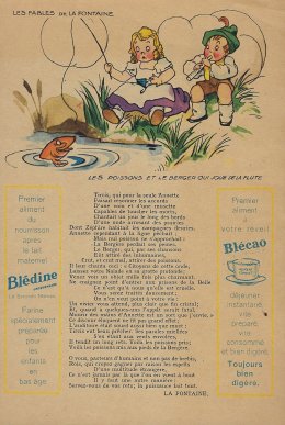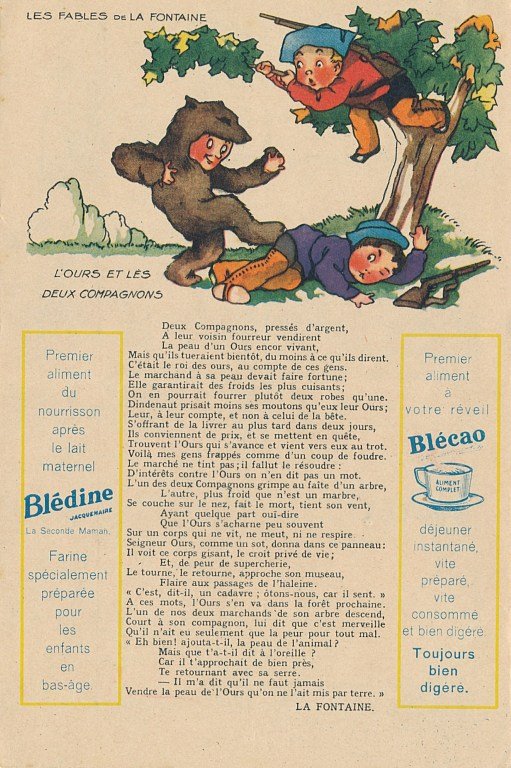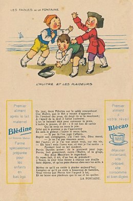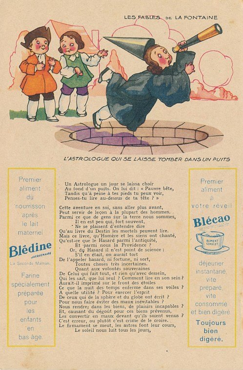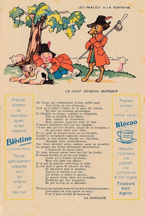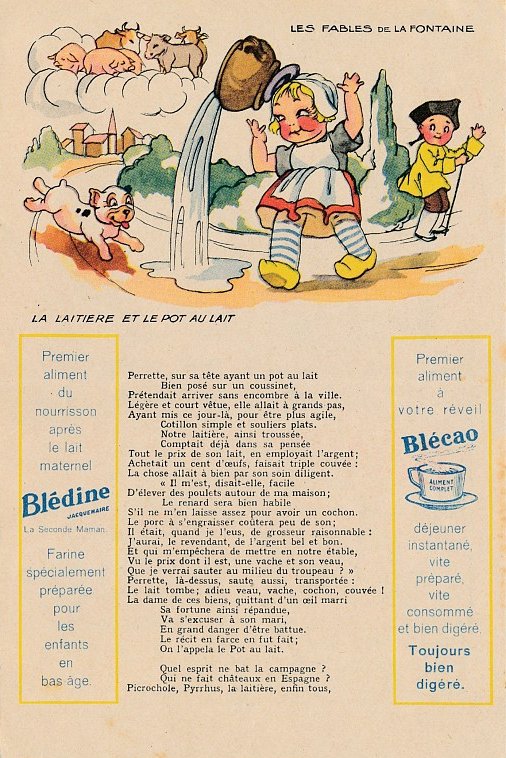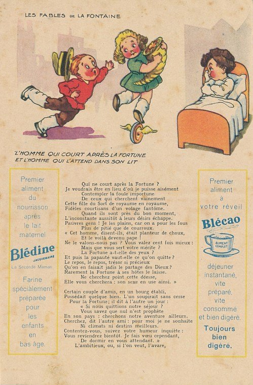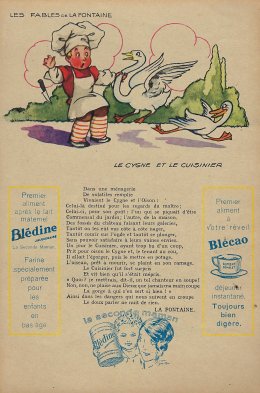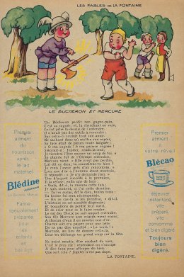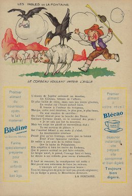1930? Six large (5½" x 8⅜") colored advertisements for Blédine nutriments offering an illustration and a text for a fable of La Fontaine. $48 from Bertrand Cocq, Calonne Ricouart, France, Sept., '18. Twelve further advertisements for €21.25 through Ebay from Eric Leneuf, Talant, France, July, ’21, including “The Fish and the Shepherd Playing the Flute”; “The Crow Wanting to Imitate the Eagle”; “The Woodcutter and Mercury”; “The Robbers and the Ass”; “The Cook and the Swan”; and “The Lion Subdued by the Man.” Four extras for €11.77 from bill2100 through Ebay, March, ’21. Six extras for €12.41 from chromosetcollections through Ebay, Jan., ’21.