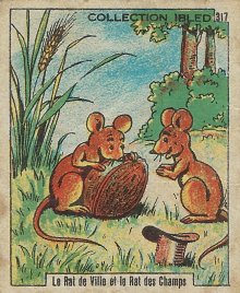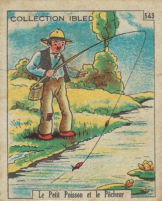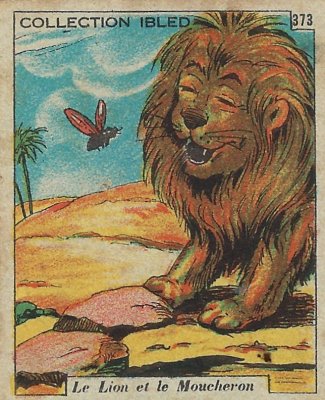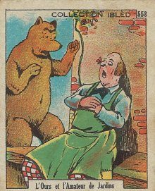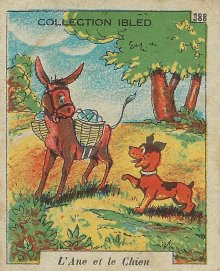 1925? Thirty small (2⅛" x 2¾") numbered colored "Collection Ibled" trade cards illustrating fables of La Fontaine. $160 from Bertrand Cocq, Calonne Ricouart, France, Sept., '18. 9 further cards for €15 from maryvonne1944 through Ebay, April, '22