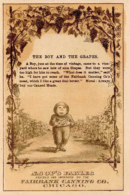 "The Boy and the Grapes" has a boy who cannot reach the grapes but does not care, since he has some Fairbank Canning Company meat, which he prefers.