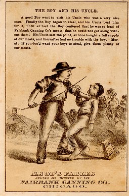 "The Boy and His Uncle" has the boy stealing because he is so fond of Fairbank Canning Company's meats that he cannot get along without them. His uncle understands, lays in a big supply, and thereafter has no problem with the boy!